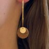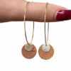 Mettez en lumière votre style avec les boucles d’oreilles pendantes de 4 cm, réalisées en cuir de carpe de Dombes caramel intense, associé à une pastille pailletée scintillante et à de l’acier inoxydable doré. Le cuir de carpe, reconnaissable à ses écailles finement texturées, se distingue ici par des reflets rouge vibrants, tandis que la pastille pailletée dorée apporte une touche festive et lumineuse à l’ensemble.