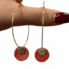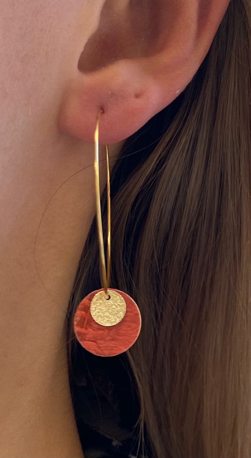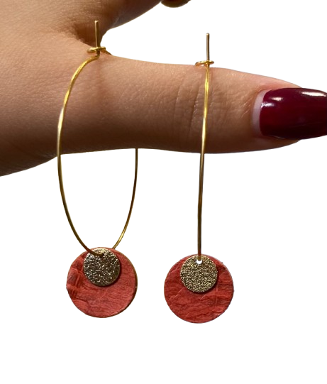 Apportez une touche éclatante et féminine à votre port de tête avec les boucles d’oreilles pendantes, ornées de cuir de carpe de Dombes framboise, sublimé par une pastille dorée scintillante. Leur forme ronde révèle la texture fine et singulière des écailles, pour un bijou à la fois élégant et moderne. La monture en acier inoxydable doré, durable et hypoallergénique, apporte une lumière chaleureuse qui souligne les nuances gourmandes du cuir framboise et le rayonnement doré de la pastille. Légères et confortables, ces boucles de 4 cm accompagnent vos mouvements avec grâce, jouant subtilement avec la lumière. Un accessoire raffiné, responsable et audacieux, parfait pour illuminer vos tenues d’une touche colorée et sophistiquée. 🌿 Fabriquées à la main en France, dans l’Ain (01), à partir de matériaux durables, upcyclés et respectueux de la peau.