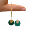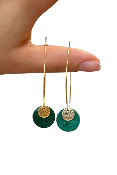La monture en acier inoxydable doré, durable et hypoallergénique, offre une chaleur lumineuse qui met en valeur les reflets profonds du vert sapin et l’éclat précieux de la pastille dorée. Légères et confortables, ces boucles se balancent avec grâce au rythme de vos mouvements, captant la lumière à chaque instant.