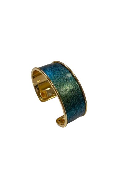 Faites scintiller votre poignet avec cette manchette Majesté habillée de cuir de carpe de Dombes teinté d’un somptueux vert irisé, aux reflets subtils et changeants selon la lumière. D’une largeur de 2 cm, cette manchette impose sa présence tout en conservant une allure élégante et raffinée, grâce à la texture naturelle et délicate du cuir de poisson, différente sur chaque pièce.